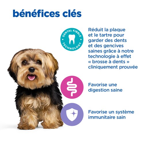 Disponible exclusivement chez les vétérinaires, Hill's VET ESSENTIALS MULTI-BENEFIT + DENTAL Adult 1+ Croquettes pour Chien est une nutrition complète aux bénéfices multiples pour les petits et très petits chiens, qui contient notre technologie de croquettes bucco-dentaires pour des dents et des gencives saines. Les croquettes de plus grande taille, contiennent des fibres monodirectionnelles qui aident à nettoyer les dents à la manière d'une brosse à dent. Non conservé artificiellement. Sans colorants synthétiques. Sans arômes artificiels.